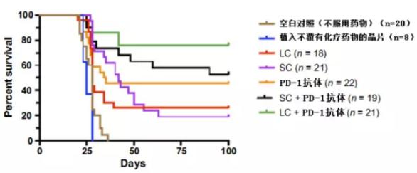在化疗也进行了两周后,研究人员从小鼠的淋巴腺、脑、骨髓中抽取了血样,对T细胞的数量进行了统计,这是衡量免疫系统完整性的一个重要指标。结果显示,SC组小鼠的T细胞数量明显较低,仅为LC组的1/3!研究人员说,这与临床上接受全身化疗的患者的情况是相符的。接下来,研究人员又比较了不同治疗方法下小鼠的存活率。在治疗结束后的100天LC组小鼠约有80%存活,而SC组为50%,单独使用PD-1免疫治疗组则只有40%多。