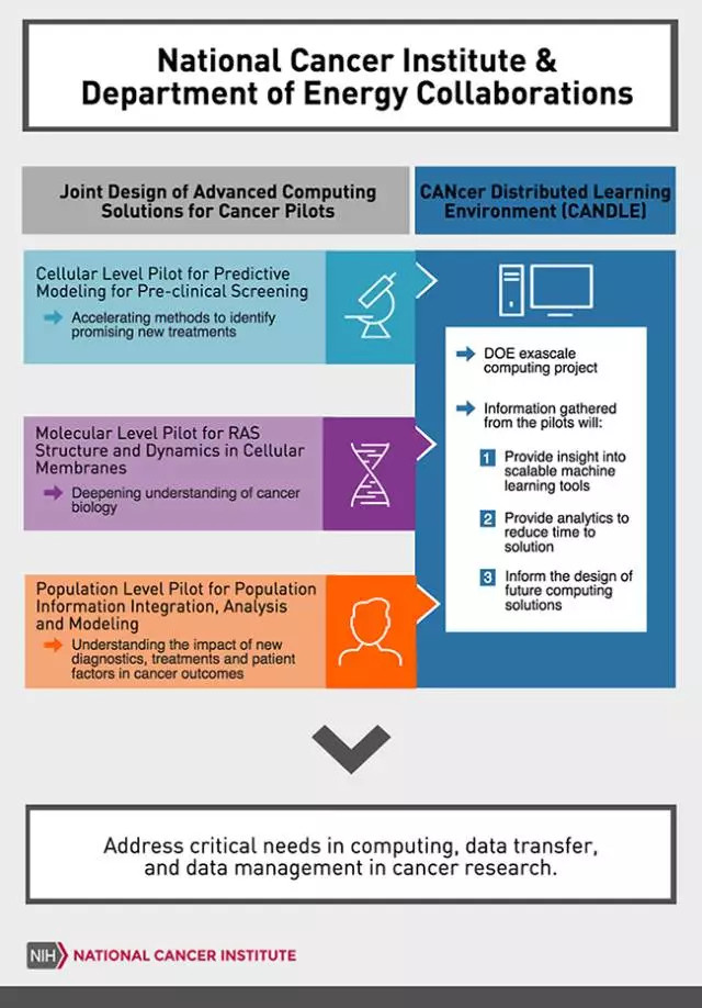 这些都是远大的目标。因此想要总结出 JDACS4C 的准确谱系,确实有点麻烦,广义上来看,它属于 PMI,美国国家癌症研究所的癌症登月计划,也集中在 美国国家战略计算计划(NSCI)之下。Stevens 指出,早在几年前就开始讨论创建这个大项目框架了,8 月拿到了第一笔资金。以下是三个试点项目的简介: