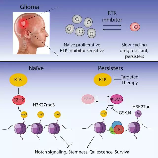 近期,《cell stem cell》杂志上的相关研究表明当受到靶向激酶抑制剂作用时,GSCs能够可逆地转变为一种慢周期性持久状态。在这种状态下,Notch信号通路被激活,进而上调初始发育的相关进程。而染色体重塑在这一转变过程中起到了关键性的作用。
