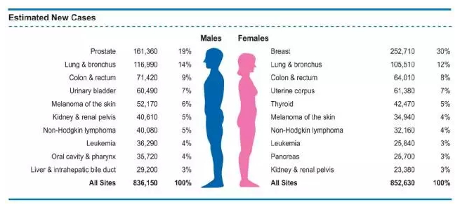 报告还发现,发病率和死亡率方面存在显着性别差异。结合所有部位,男性的癌症发病率比女性高出 20%,且男性的癌症死亡率也高出 40%。