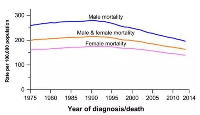 美国 1975 年至 2014 年癌症死亡率下降趋势(根据性别分类)
