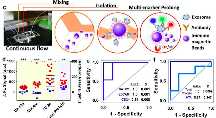 微流体芯片技术最近已备受瞩目,成为外泌体分离和分子分析一个非常有前景的方法,因为它的容量消耗低、功能组件集成能力高、分析时间快、且高灵敏度。几种微流体的方法,如分离、定量和分子分析,都是在外泌体研究前已开发完成。正因如此,通过微流体外泌体分析,将会是肿瘤液体活检很有潜力的新方法。