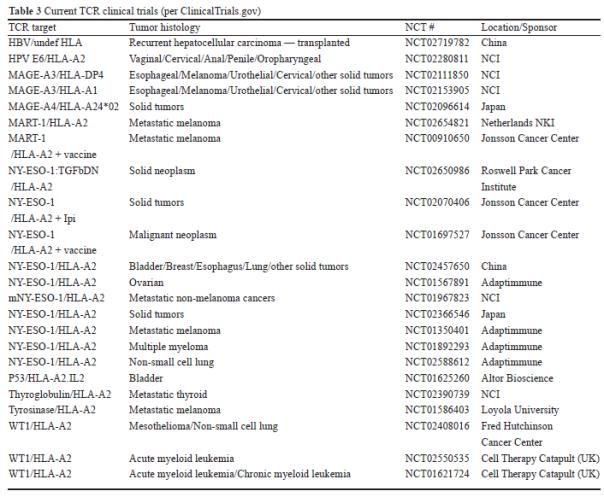 具体来说,研究人员将表达T细胞受体(T-cell receptor,TCR)的“改造版”淋巴细胞通过静脉注射回输到患者体内(图1(来源:Cell Research)图1)。参与试验的17名转移性黑色素瘤患者中,有2人出现了抗肿瘤响应。虽然这离治愈还很遥远,也比TIL疗法响应率低,但却证明了基因工程外周血(peripheral blood)T细胞确实能够在晚期转移性癌症中发挥作用。在该部分内容中,作者们围绕亲和力(Affinity)、治疗除黑色素瘤外的其它癌症等方面,回顾了近十年TCR-T疗法的研究进展(表3)。