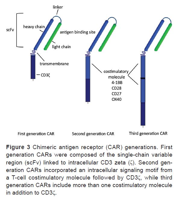 CAR(chimeric antigen receptors,即嵌合抗原受体)的概念最初由Zelig Eshhar等科学家在1989年的一篇PANS中提出(论文:Expression of immunoglobulin-T-cell receptor chimeric molecules as functional receptors with antibody-type specificity.)。该综述中,作者们首先回顾了CAR结构的更新换代史(图3)。