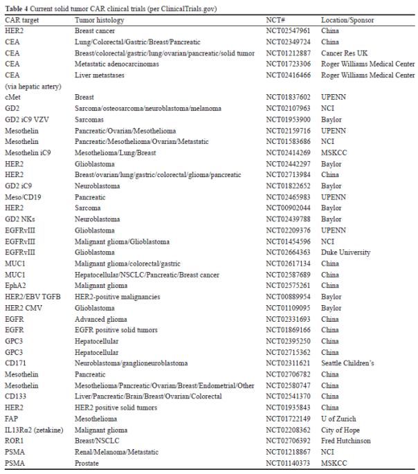 目前,在ClinicalTrials.gov网站上共有39个利用CAR-T细胞治疗实体瘤的临床试验(表4、图4)。其中,大部分疗法是靶向肿瘤相关自体抗原,包括HER2、GD2、cMET、EGFR、MUC1、EphA2、GPC3、CD133 和CD171;少数是靶向非肿瘤抗原(被认为是肿瘤生长和生存必不可少的),如VEGFR、FAP。