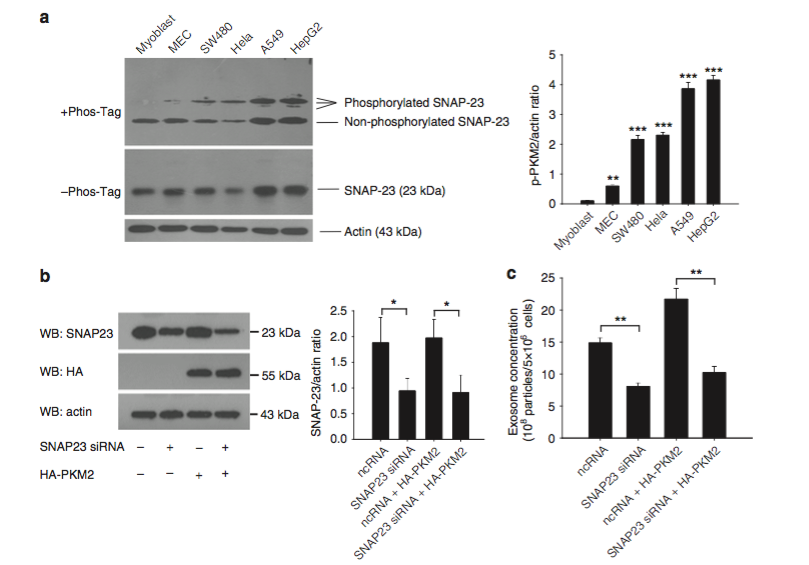 参考文献:Wei Y, Wang D, Jin F, Bian Z, Li L, Liang H, Li M, Shi L, Pan C, Zhu D, Chen X, Hu G, Liu Y, Zhang CY, Zen K. Pyruvate kinase type M2 promotes tumour cell exosome release via phosphorylating synaptosome-associated protein 23. Nat Commun. 2017 Jan 9;8:14041.