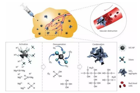 肿瘤的快速生长依赖于充分的氧组分和养分的供给,事实上是人体的血管系统养活了肿瘤。与以上利用氧组分或原位产生 ROS 的思路相反,设想如能利用某种可以进入肿瘤组织和细胞的纳米颗粒,这些颗粒能够响应肿瘤的特异性微环境,大量消耗肿瘤内的氧分子,同时阻塞其中的血管系统,阻止外部氧分子和养分的供给,就有可能实现肿瘤的饥饿治疗。然而一般的方法很难实现如上具有肿瘤特异性的局部饥饿治疗。最近,该团队采用改进的自蔓延燃烧方法,成功制备出单分散的、直径约一百纳米左右的硅化镁(Mg2Si)纳米颗粒。这种纳米颗粒的显著特点是,正常组织的中性环境下稳定,无毒无害;而在肿瘤的弱酸性环境下,可以与质子反应生成硅烷(SiH4)。这种硅烷分子极易与氧分子反应,从而大量而快速消耗氧组分;在此同时,产生的 SiO2 中间产物,原位堵塞血管,防止外部的氧分子和养分通过肿瘤血管系统的供给,从而抑制肿瘤生长,达到肿瘤治疗效果。这种策略具有如下显著优势:1)Mg2Si 纳米颗粒无毒无害,而且容易大规模制备,成本很低;2)颗粒即使大量进入正常组织也能在其中性环境下稳定存在,无副作用;而在肿瘤弱酸性下很快大量消耗氧组分,因而具有明显的肿瘤特异性;3)原位产生的副产物氧化硅同样无毒无害,却可以堵塞肿瘤血管系统,阻止外界养分和氧的供应;4)而最后,这些氧化硅颗粒还可以在一定时间后彻底降解,从而从根本上不存在毒副作用(Nature Nanotechnology, 2017,DOI: 10.1038/NNANO.2016.280)。
