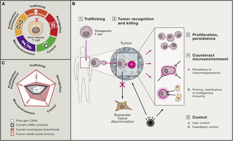该文章突出了使用肿瘤浸润淋巴细胞(TIL)和 CAR-T 细胞的开创性临床研究中所获得的经验教训。这些经验表明,我们在开发有效对抗实体瘤的 T 细胞治疗方法时,必须解决多个挑战:改善肿瘤识别的精确性,以避免与正常组织发生毒性交叉反应;提高 T 细胞持久性和增殖能力;改善攻击肿瘤的有效性;克服免疫抑制肿瘤微环境的机制;并改善 T 细胞的支配能力。