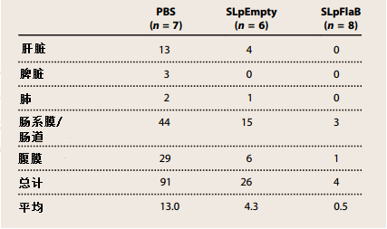 然后,他们做了关于肿瘤转移情况的对比实验。将小鼠分为三组,一组注射能产生 FlaB 的鼠伤寒沙门氏菌(8 只),一组注射转入了空载体的鼠伤寒沙门氏菌(6 只),还有一组作为对照,注射磷酸缓冲液(PBS,7 只)。经过治疗,FlaB 组的 8 只小鼠中有 3 只发生了转移,不过研究人员只发现了 4 个病灶。另外两组小鼠的状况则糟糕得多,空载体组小鼠体内发现了 26 个病灶,而 PBS 组的病灶多达 91 个(不过研究人员在论文中并未透露这两组小鼠中有几只发生了转移)!