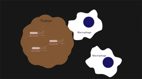 鼠伤寒沙门氏菌进入肿瘤细胞后,巨噬细胞(白色)吞噬肿瘤示意图