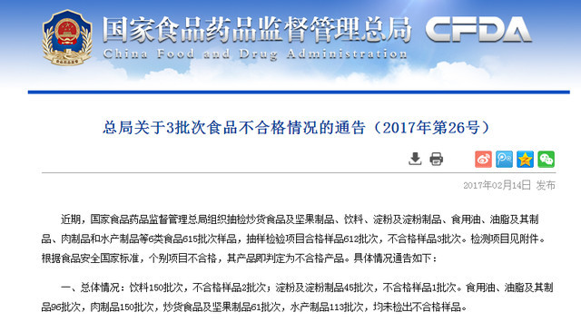 2月14日,国家食品药品监督管理总局在其官网发布消息,称在近期的抽检中,发现不合格样品4批次,其中乐百氏(广东)桶装水发展有限公司武汉分公司生产的乐百氏饮用天然泉水,溴酸盐检出值比标准规定高出40%。