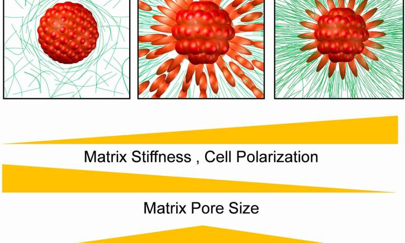 Shenoy 及其同事发表了详细的研究结果,详细描述了癌细胞和周围 ECM 的反馈机制。在那里,他们表明这种机制如何使 ECM 中发现的胶原纤维硬化和对齐。新工作着眼细胞如何从圆形切换到细长形。
