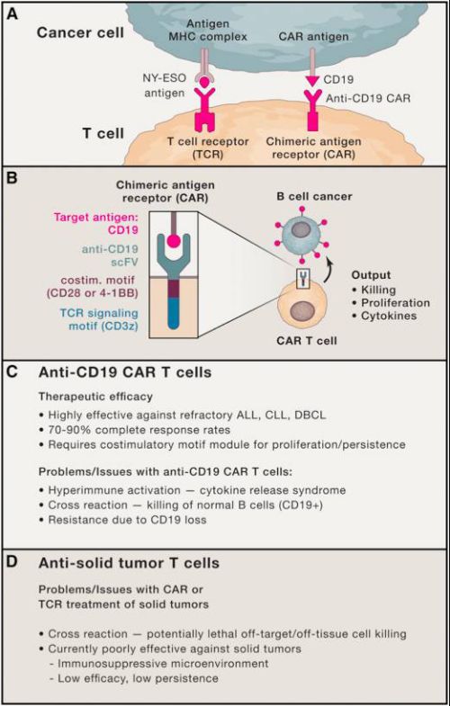 免疫细胞在肿瘤治疗上最大的挑战是实体瘤。科学家进行了很多尝试(图2D)。如:采用注射携带TCRs或CARs的T细胞来进行免疫治疗;发现了TCR与MAGE家族的强烈交叉毒性反应;对除了CD19的其他靶标(如叶酸受体1α,CD171)的实验等。从中我们得知:
