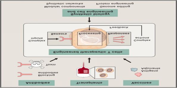 图1:免疫T细胞疗法提供复杂疾病(如癌症)的新的解决平台:疗性的T细胞结合传统治疗方法的元件,集成智能感知和应答剂;同时合成生物学提供免疫治疗细胞编程的工具和方法,来自《Cell》