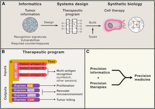我们已经进入了一个不平凡的精准生物信息时代,开始获得关于肿瘤的高度详细的信息 – 哪些抗原存在,哪种类型的抑制分子存在,以及这些是如何分布在组成肿瘤的不同细胞生态系统里(Tirosh et al。,2016)。我们现在有可能使用信息数据来设计优化的治疗反应系统,识别分子特征,攻击肿瘤细胞。我们还可以使用我们新兴的合成生物学工具构建这些系统(图5B)。如果我们能够成功地将精准生物信息与精准细胞治疗相结合,使得这种信息数据的应用方法变得可行(图5C),推动精确医学的概念实现。