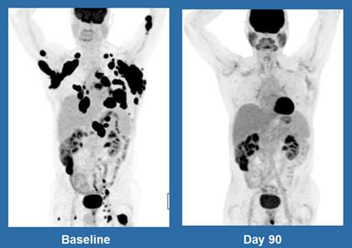 这是一个 62 岁非霍奇金淋巴瘤患者的扫描图,2015 年 12 月在 Kite 接受了 CAR- T 细胞疗法。治疗三个月后,他的肿瘤明显减少了。
