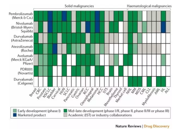 ▲各个主要抗 PD1/PD-L1 疗法研发项目对癌症适应症的覆盖(图片来源:《Nature Reviews Drug Discovery》)