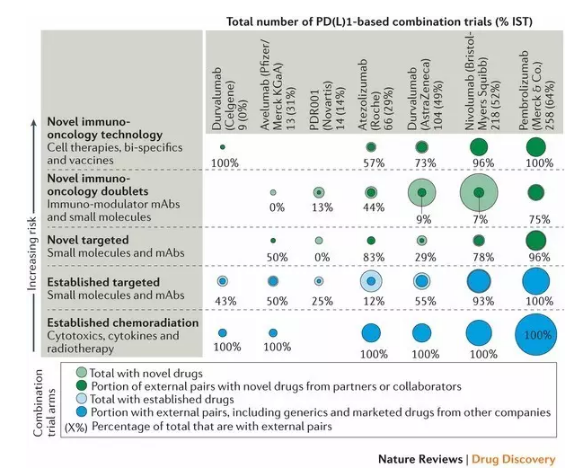 ▲图二:领先药企正在进行的肿瘤免疫学疗法组合试验(图片来源:《Nature Reviews Drug Discovery》)