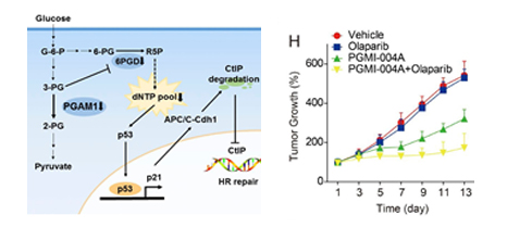 为了全面认识 PGAM1 在肿瘤中的功能,中国科学院上海药物研究所研究人员从蛋白质组学研究出发,系统剖析 PGAM1 功能下调影响肿瘤细胞中的诸多信号通路,首次发现了 PGAM1 对肿瘤细胞 DNA 损伤应答的影响。机制研究揭示,PGAM1 通过酶活功能调控磷酸戊糖旁路,维持细胞内 DNA 合成元件——dNTP 的水平。细胞内 dNTP 失衡,能激活 p53/p73 依赖的 APC/C-Cdh1 E3 泛素连接酶活性,下调 DNA 同源重组修复(HR)核心蛋白 CtIP 的蛋白稳定性,进而影响 HR 修复通路功能。基于上述机制认识,研究人员提出了 PGAM1 抑制剂与 PARP 抑制剂的协同致死机制,并在三阴乳腺癌模型中得到证实。该研究可能为新近上市的 PAPR 抑制剂(Olaparib)开辟更广阔的应用空间,为 PARP 抑制剂治疗 BRCA 野生型肿瘤带来新契机,并为 PGAM1 抑制剂的未来应用指明了方向,具有重要的转化价值。
