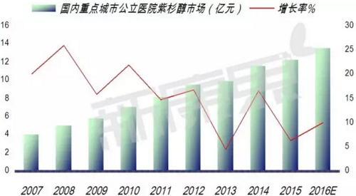 数据显示,2016 年 1 - 3 季度重点城市公立医院紫杉醇药物销售金额达 10.15 亿元,预示 2016 年全年紫杉醇用药为 13.54 亿元;同比上一年增长 9.96%,具有广阔的应用前景。TOP3 厂商是绿叶思科占据 60.73%、费森尤斯卡比占据了 14.17%、布迈施贵宝 /Corden 占据了 10.49%。