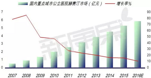 数据显示,2016 年 1 - 3 季度重点城市公立医院曲妥珠单抗用药销售金额达 4.41 亿元,预示 2016 年在我国重点城市公立医院曲妥珠单抗用药销售金额达 5.88 亿元,同比上一年增长了 11.07%。赫赛汀药物毒性低,治疗效果表达明显,生存时间延长,对提高晚期癌症患者生活具有积极意义,是带动抗肿瘤单抗市场增长的动力。