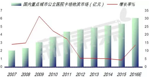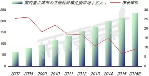 据中康 CMH 数据显示,2015 年国内医药终端市场抗肿瘤用药达到了 950 亿元,同比上一年增长率为 13.53%。预计 2016 年中国抗肿瘤终端市场将达到 1050 亿元。同比上一年增长 10.52%。