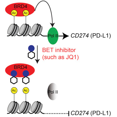 张如刚教授的研究团队在寻找抑制PD-1/PD-L1信号通路的小分子药物的过程中发现了一系列BET抑制剂具有这样的功能。他们使用了其中一种实验性药物JQ1,在卵巢癌的小鼠实验中,JQ1有效地降低了PD-L1的表达和信号传导,减慢了肿瘤生长速度,并延长了患病小鼠的寿命,同时还没有引起很强的炎症反应。JQ1并不需要直接与PD-L1或PD-1结合就能够起到抑制信号传递的作用,那么它是怎么做到这一点的呢?