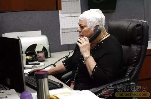 ▲一些患者戴上了“电场发生帽”后,一边治疗可以一边工作(图片来源:medicalxpress)