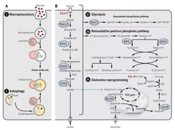 癌细胞的一大特点是其新陈代谢与正常细胞有很大的区别,因为癌细胞需要大量的营养和能量来支持其快速的生长过程。最近的一些研究显示 RAS 突变调控了其中一些过程,如果能够抑制这些过程,也有望抑制 RAS 突变肿瘤的生长。