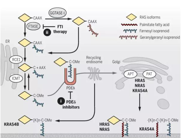 研究发现,RAS 的致癌功能与其在细胞内的位置有很大关系,当 RAS 位于细胞膜的内表面时活性最强。最近的研究还发现了对 RAS 蛋白翻译后的修饰控制了其在细胞内的位置。在 RAS 转移去细胞膜的过程中的第一步是由法呢基转移酶(farnesyltransferase)在 RAS 的 C 端加上一个法呢基。因此,在 90 年代时,抑制法呢基转移酶的活性是 RAS 药物研发中的重点,不过其中至少两个药物都在 3 期临床中失败了。后来发现,4 个 RAS 蛋白中最常见的 KRAS4B 可以得到一个与法呢基结构类似的香叶基香叶基异戊二烯(geranylgeranyl isoprenoid)来完成向细胞膜的转移。最近,通过筛选可以直接抑制 RAS 与细胞膜结合的小分子,发现了一个潜在的药物 fendiline,它可以选择性地减少 KRAS4B 与细胞膜的结合。