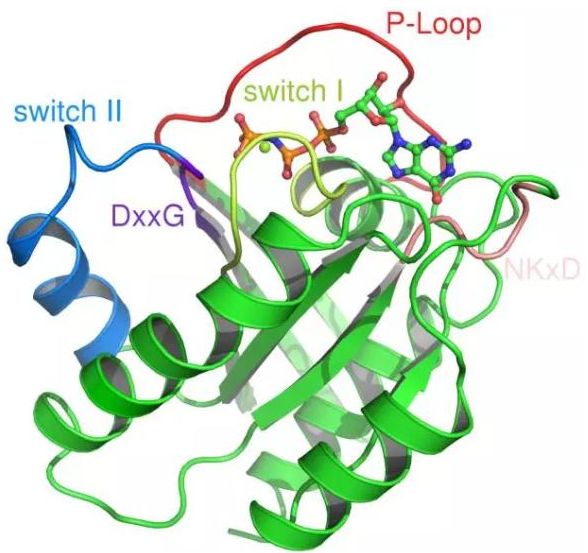 三个 RAS 基因编码了 4 个非常相似的蛋白质:KRAS4A、KRAS4B、HRAS 和 NRAS,它们都是三磷酸鸟苷水解酶(GTPases)。RAS 基因的突变会导致其编码的 GTPases 处于持续活跃状态,激活下游信号通路,促进癌细胞生长。