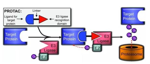 在自然情况下,E3 泛素连接酶需要一个特殊的识别信号来招募并泛素化它的目标蛋白。而 PROTAC 技术的出现使 E3 泛素化任何一个蛋白成为可能。这项技术设计一个双重功能的分子,其一端可以结合目标蛋白,另一端结合 E3 连接酶,并将两者形成一个聚合物。此时 E3 就能够泛素化目标蛋白并引导其进入降解通路。