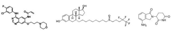 ▲Canertinib(左)、fulvestrant(中)和 lenalidomide(右)分子结构 (图片来源:维基百科)