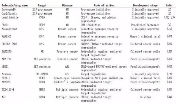 研究显示,一些被用作抑制致癌蛋白活性的小分子药物同时能够促进目标蛋白的降解。比如说 canertinib 是一个酪氨酸激酶 ErbB- 2 的抑制剂,ErbB- 2 在多种癌症内有表达,而 canertinib 可以增加 ErbB- 2 的多聚泛素化以促进其降解。ERα的抑制剂 fulvestrant 是另一个例子,它也可以促进 ERα的降解。在携带 ERα的乳腺癌患者中,fulvestrant 比另一个没有促进蛋白降解作用的 ERα抑制剂 tamoxifen 的疗效更好。对于急性早幼粒细胞白血病非常有效的药物三氧化二砷,同样可以促进在该病患者中常见的融合致癌蛋白 PML-RARα的降解。