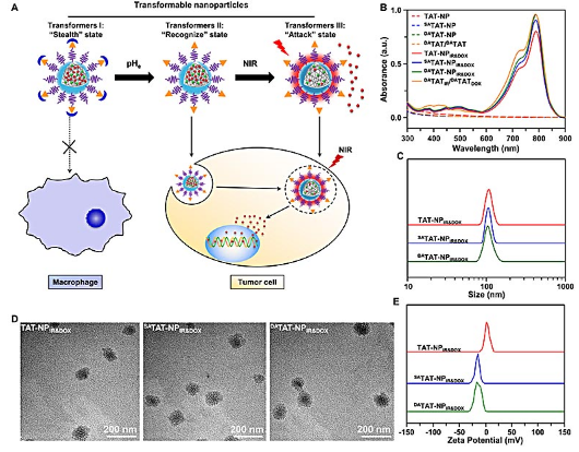 杨显珠教授及王均教授团队利用肿瘤酸性微环境的特点以及近红外光调控的方法,发展了可“变身”式纳米载体,以调控纳米药物与生物系统的相互作用。该纳米体系由穿膜肽(TAT,“YGRKKRRQRRRC”)功能化的聚乙二醇—聚磷酸酯嵌段聚合物组装而成;其中 TAT 多肽赖氨酸的氨基被肿瘤酸度敏感的 2,3- 二甲基马来酸酐修饰,疏水内核同时包载化疗药物 DOX 和光热治疗试剂 IR-780,从而制备了 DATAT-NPIR&DOX。通过静脉给药后,DA 修饰的纳米体系 DATAT-NPIR&DOX 处于“隐形”状态,有效降低其与巨噬细胞等的相互作用,从而延长其在体内的循环时间;当纳米颗粒进入肿瘤组织后,TAT 被重新激活,纳米药物进入被“识别”状态(“recognize” state),增强与肿瘤细胞的相互作用,促进纳米颗粒被肿瘤细胞摄取;随后 IR-780 在近红外光照射下产生光热效应,驱动药物快速释放,纳米药物进入“攻击”状态(“attack” state)。这种肿瘤酸度 / 近红外光调控纳米药物与生物体相互作用的设计策略,有效提高了药物抗肿瘤的效果。