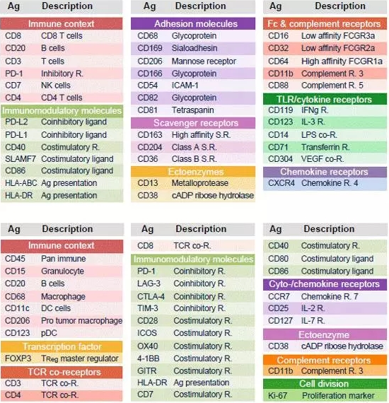 ▲用于肿瘤相关巨噬细胞(上)和 T 细胞(下)分型的蛋白标记(图片来源:《细胞》)