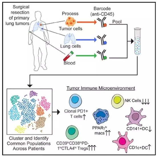 另一项由西奈山伊坎医学院(Icahn School of Medicine at Mount Sinai)Miriam Merad 教授领导的研究,绘制早期肺腺癌肿瘤微环境中免疫细胞的详细图谱。他们将正常的肺组织和血液样本与肿瘤样本进行了单细胞对比分析,发现早期的肿瘤就已经开始在改变其微环境中的免疫细胞组成和表型了,尤其是 T 细胞、天然杀伤细胞和肿瘤浸润髓系细胞(TIM)。
