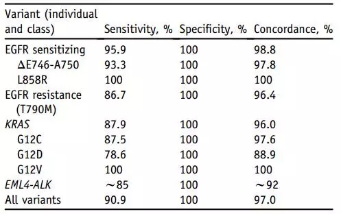 ▲肺癌基因新型血检,对每种基因变异的检测特性的总结
