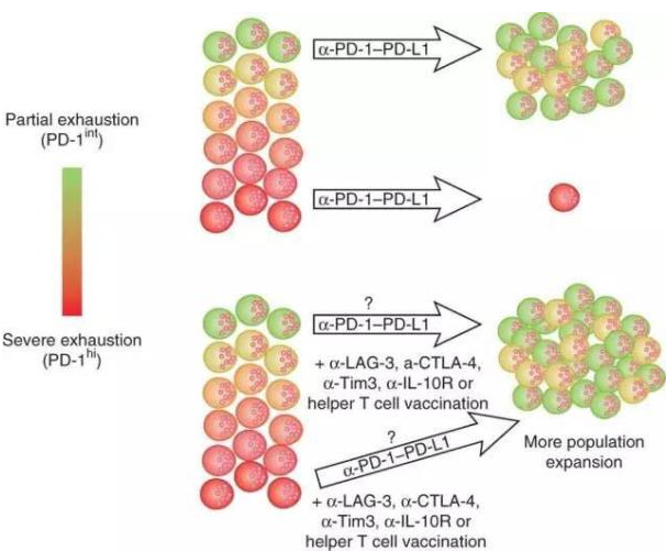 ▲采用抗 PD-1/PD-L1 抗体及其他药物几乎衰竭 T 细胞 (图片来源:《Nature Immunology》)