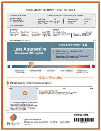常用的前列腺癌恶化风险的评估包括临床检查以及前列腺特异性抗原 (prostate-specific antigen, PSA) 测试。这些传统的检测方法被广泛使用,但是它们只能准确描述肿瘤当前的状态,不能很好地判断肿瘤恶化的风险。Myriad Genetics 公司开发出的 Prolaris 检测通过测量前列腺肿瘤组织中与癌细胞生长相关的 46 种基因的 RNA 表达量来评估肿瘤细胞的生长特性,从而更精确地评估肿瘤恶化风险。Prolaris 检测能够将肿瘤恶化风险数字化,测试结果数值越高,患者的肿瘤恶化风险越大。