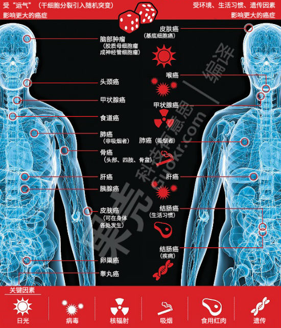 “所有的癌症都是坏运气、环境和遗传综合作用的结果,而我们建立了一个模型,来判断这三种因素各自到底对癌症有多大贡献。”霍普金斯大学医学院教授伯特•沃格斯坦(Bert Vogelstein)说。他所说的,就是突变的三种来源。有些突变是环境所致,比如吸烟或者接触了别的致癌物。有些突变是你从父母遗传来的,或者遗传了别的容易引发新突变的因素。但还有些突变单纯就是“运气不好”——细胞分裂、DNA复制的时候总会无可避免地偶尔犯点儿错误,复制得多,错得就多。