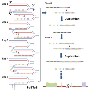 为了进一步阐述肿瘤细胞基因拷贝数异常形成的机制,作者团队对该病人癌基因 MYC 所在的 8 号染色体的 4 个拷贝数增加区域进行了单碱基水平的单细胞结构变异分析,并提出一个形成多区间拷贝数变异的两步模型: 首先在 DNA 复制过程中由于一系列的复制叉停顿和模板转位(FoSTeS)形成多区间拷贝数增加;随后通过同源重组(Homologous Recombination, HR)进一步将该区域扩增到较高的拷贝数,最终形成肿瘤细胞中异常的拷贝数模式。
