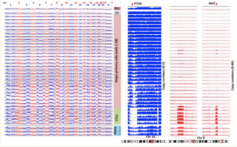 图二、结直肠癌病人原发灶肿瘤单细胞,循环肿瘤细胞和转移灶癌组织基因组拷贝数模式以及 PTEN,MYC 基因拷贝数变化