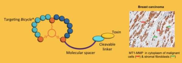 Bicycle Therapeutics 的先导分子在研新药 BT1718 是其药物共轭物(BDC)技术的第一个优秀例子,其中化学毒性有效载荷专门针对了恶性肿瘤,并且通过肾清除机理最小化全身性的毒素暴露。BT1718 靶向 1 型基质金属蛋白酶(MT1-MTP),该蛋白分子在三阴性乳腺癌和非小细胞肺癌等众多实体瘤中高度表达。预计 2017 年间,Bicycle 将与英国癌症研究所(CRUK)合作进入临床研究阶段。B 轮融资还将通过早期临床开发资助该公司其它的在研管线计划。
