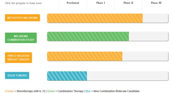 ImmunoPulse® IL-12 目前处于临床开发,用于转移性黑色素瘤和三阴性乳腺癌(TNBC)的治疗。在 I 期和 II 期临床研究中,其针对多种实体瘤具有良好的安全性,同时表现出明显的抗肿瘤活性和系统性免疫应答。除了 ImmunoPulse® IL-12 之外,OncoSec 也正在开发基于 ImmunoPulse 技术平台的其他免疫靶向制剂。