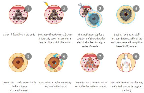 IL-12 是一种体内自然产生的蛋白质,具有免疫刺激功能。pIL-12 是 OncoSec 先导候选产品 ImmunoPulse® IL-12 中的活性生物制剂,后者是一种潜在首创(first-in-class)的瘤内抗癌基因疗法,通过瘤内注射及短脉冲电穿孔递送至肿瘤微环境中,产生受控的、局部表达的 IL-12,从而使免疫系统能够靶向并攻击肿瘤细胞,其基于 OncoSec 公司的核心技术平台 ImmunoPulse 开发。