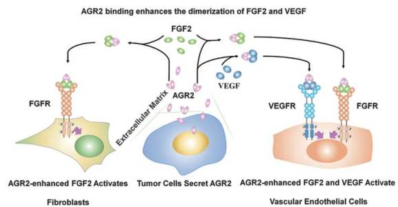 李大伟团队在观察裸鼠荷瘤实验中 AGR2 抗体 18A4 的抑制肿瘤效果时受到启发,猜测 AGR2 可能参与了肿瘤的血管形成。通过一系列科学严谨的细胞学实验验证,该团队发现 AGR2 蛋白能够促进血管内皮生长因子 VEGF 和碱性成纤维细胞生长因子 FGF2 的促血管形成活性。进一步的分子生物学研究表明,AGR2 可以直接和 VEGF、FGF2 相结合,并能够通过促进 VEGF 和 FGF2 分子自身的二聚化的方式增加肿瘤局部环境中的活性 VEGF 和 FGF2 浓度,最终导致血管内皮细胞及成纤维细胞向肿瘤细胞周围的迁移和聚集,为肿瘤微环境的形成提供了有利条件。这一新作用机制的发现第一次将分泌型 AGR2 蛋白与肿瘤微环境中的蛋白信号网络联系了起来,揭示了 AGR2 在肿瘤信号传递网络中所扮演的角色,为基于 AGR2 的肿瘤治疗药物的开发提供了科学的理论指导。