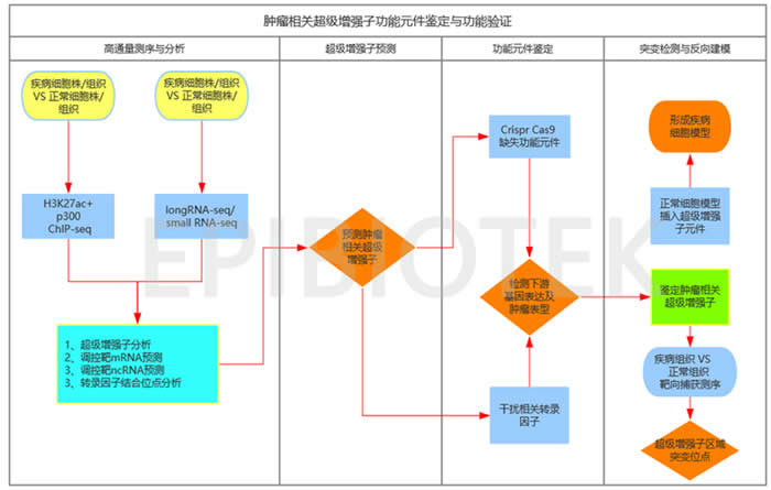 超级增强子的研究涉及 ChIP-seq、生物信息分析、后期功能研究等关键技术,存在一定的难度。表观生物结合自身技术优势,在国内率先推出针对目前超级增强子的关键研究技术服务,制定整体研究方案以供参考,希望促进国内肿瘤超级增强子研究的发展,推动肿瘤精准诊断与治疗的进步: