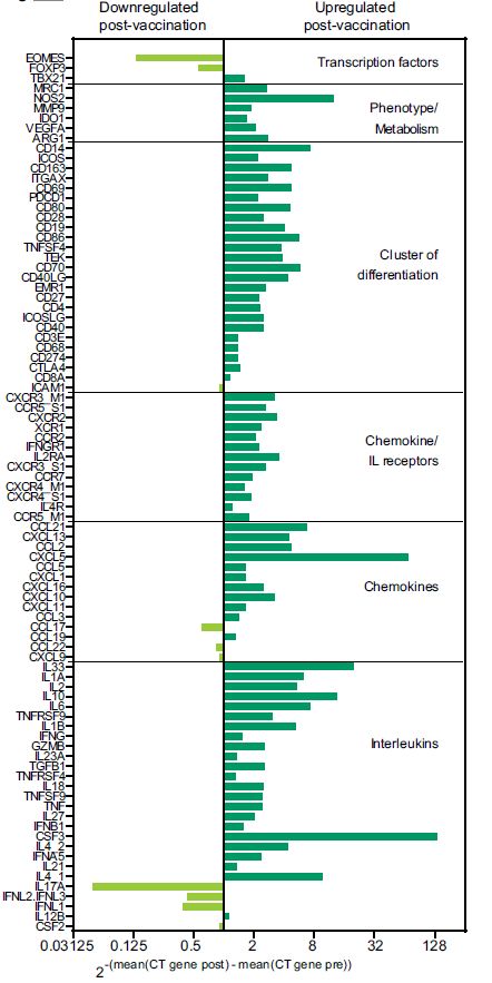 另一个重要因素是对疫苗临床疗效的评估,从而筛选出最有效的疫苗进行接种。在"Personalized RNA mutanome vaccines mobilize poly-specific therapeutic immunity against cancer"文章中,研究人员利用Biomark HD系统和基因表达芯片对接种疫苗前、后,肿瘤样本中的免疫基因表达水平变化进行了细致分析,从细胞因子、信号转导、表型和代谢机理等多角度对疫苗疗效进行综合评估(图3,ref 2)。