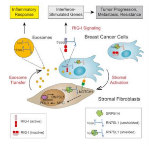 与细胞中的大多数 RNA 不同,RN7SL1 具有类似于病毒 RNA 的特殊末端。在乳腺癌细胞的指导下,成纤维细胞确保外泌体保持病毒样的末端暴露,欺骗细胞对外泌体做出如同病毒感染一样响应。